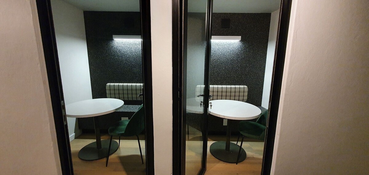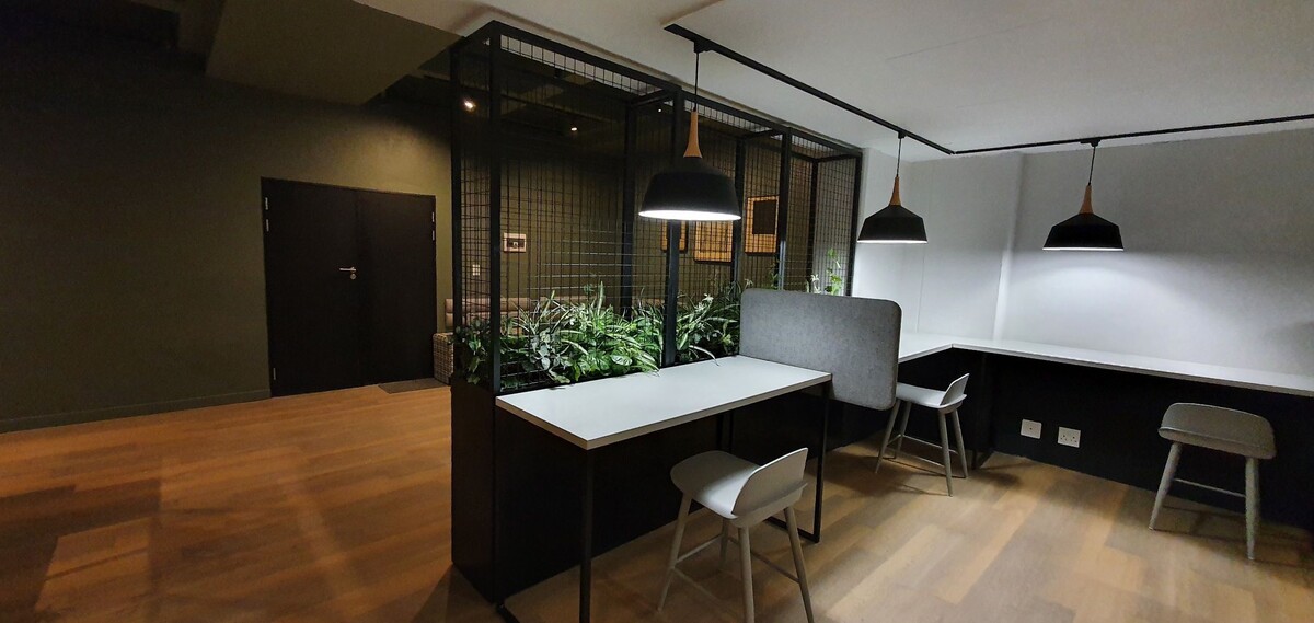 Ideal for remote work, the co-working space offers private booths for meetings, desks, and a lounge with reliable Wi-Fi and backup power. Although the apartment is cleaned weekly, laundry services are conveniently available for a modest fee. The 34sqm space is cozy for up to two adults and one infant, and security is a priority with biometric access.